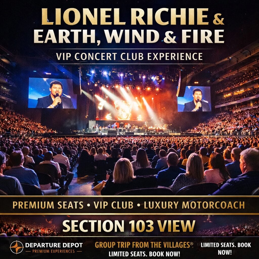Join Departure Depot for a premium Tampa concert experience featuring Lionel Richie and Earth, Wind & Fire live, paired with exclusive pre-show VIP Concert Club access, and comfortable group transportation from The Villages®.